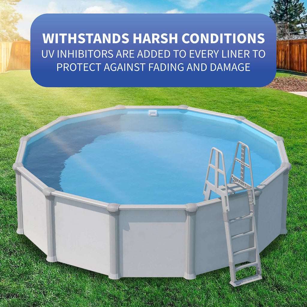 Enhance the timeless appeal of your above-ground pool with this vibrant, solid-blue vinyl liner. Its borderless design is simple and classic, making it an ideal choice for any pool. Made from premium, standard-gauge vinyl, this liner features UV inhibitors to protect against fading and damage from sunlight and water. The welded seams ensure a smooth surface and long-lasting durability. Backed by a 15-year warranty.Attributes