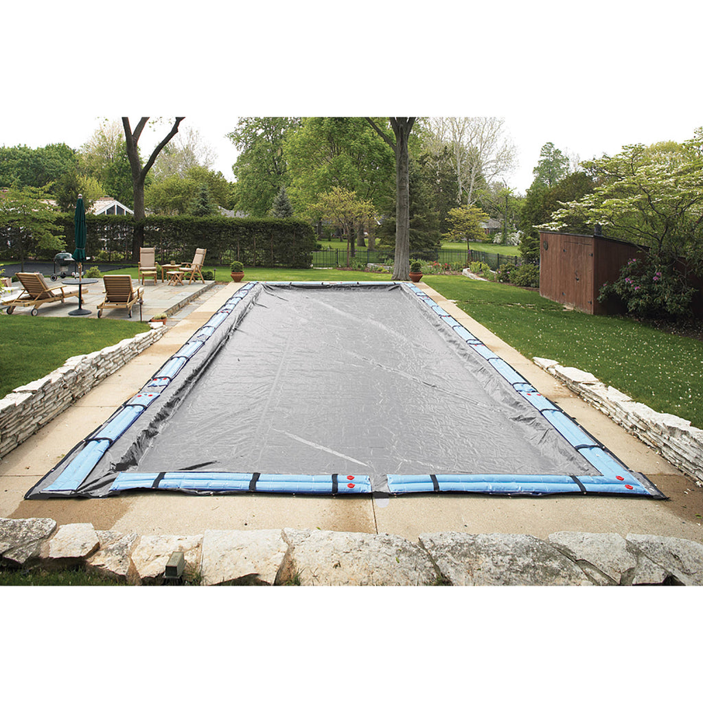 Our top of the line "Gorilla" winter cover has quality features that are unmatched. The triple strength construction of this cover ensures its long life. The dense thick layer of polyethylene on the top and bottom of the cover are reinforced by a super strong inner scrim that resists rips and tears. The black underside of the cover retards algae growth and heat sealed seams mean a crystal clear pool next spring. Our Gorilla covers have full UV protection embedded in the material to resist the harmful effects of sunlight for many years. The big 5 foot overlap ensures a proper fit and reduces stretching and ripping. Our Gorilla covers have sewn-in loops every 4-ft to secure water bags, and corner grommets to allow for extra tie downs in windy areas. This cover is built from the finest materials and carries a 20 Year Warranty (5 Years Full Rated). It is silver in color with a black 3-LAYER STRENGTH: Superstrong triple layer construction will not rip or tear.Attributes