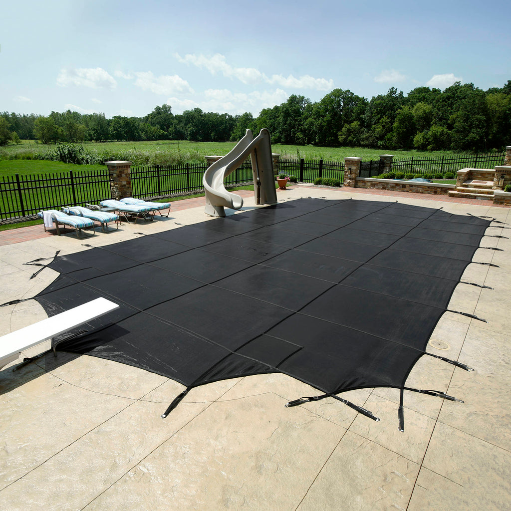 Our Premium Commercial Mesh covers are manufactured with industrial-grade mesh fabric that will withstand heavier snow loads, extreme wind, longer exposure to harmful UV rays and will last 2 TIMES longer than a standard mesh cover. Covers are made with 5'x5' reinforcing straps that make them 50% stronger than traditional mesh safety covers with a break strength of over 5200 lbs. Premium Commercial Mesh's heavy construction and unique weave means this cover won't rip even after a large branch or sharp object cuts the cover. Reinforced straps and super tough mesh means the Premium Commercial Mesh cover resist deck abrasion much better. Our tight weave mesh provides your pool with two layers of protection. Since the covers' weave is tighter than a standard mesh cover it provides excellent shade, which reduces algae growth in the spring. The mesh screens out all but the finest debris, but allows the cover to drain eliminating spring cover pumping. Since almost no dirt or debris get into your pool and the water is virtually algae free - spring opening is quick & easy. The cover is loaded with UV inhibitors so Commercial Mesh will last for many years in areas with intense sunlight. All this performance comes in a lightweight cover that is easy to remove and install. Premium Commercial Mesh covers are installed like conventional safety covers, using brass anchors and stainless steel springs. This premium cover comes complete with anchors, stainless steel springs, installation tool, storage bag and compete installation instructions. It is built for longevity and strength, and is backed by a 30-Year Warranty. Available in Black or Green.Attributes