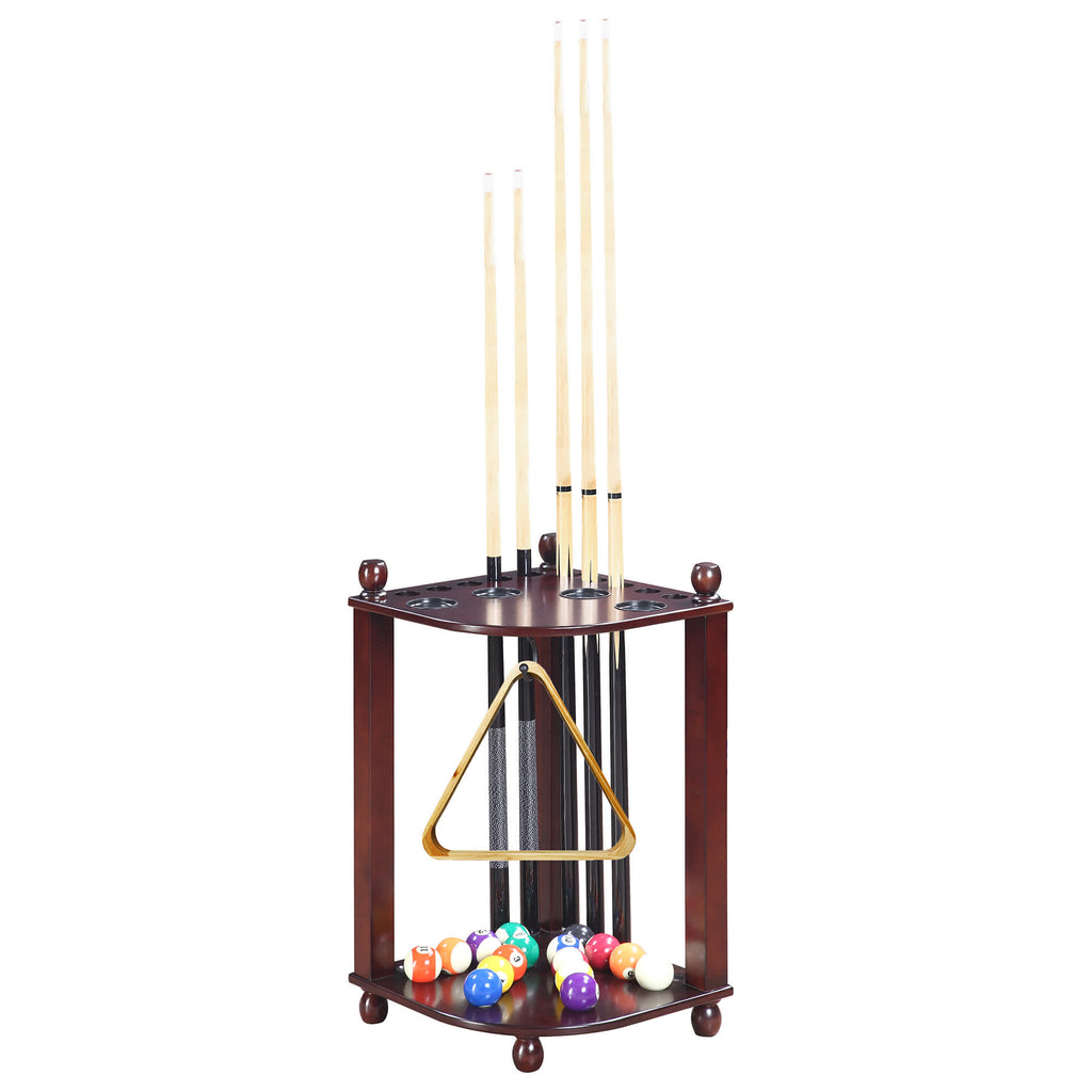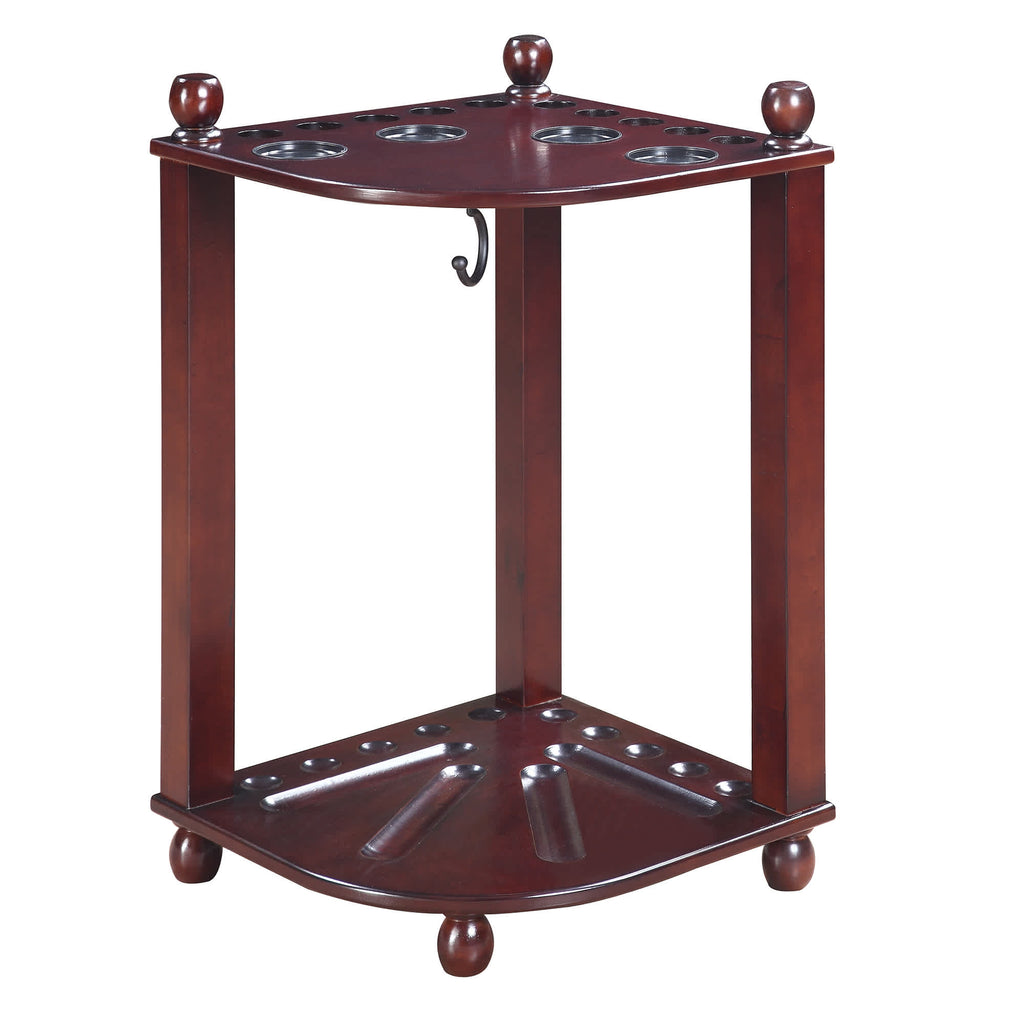 The Regent Corner Floor Cue Rack is essential for anyone who owns a billiards table. This furniture-quality rack has plenty of room to store cues, balls, racking triangles, and most other billiard accessory items. The Regent features 4 built-in, recessed, drink holders to keep your refreshments close to the action. Keep your game room neat and organized with this space-saving cue rack. 180-day limited warranty.Attributes