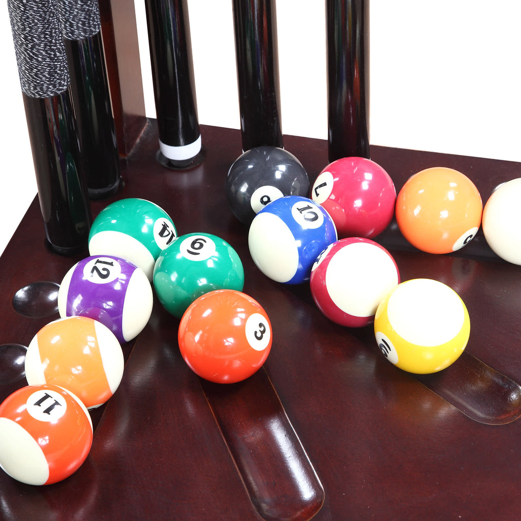 - Holds 10 cues, 1 set of pool balls, 1 ball rack, and plenty of additional room for other accessory items