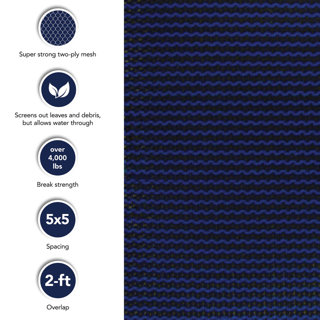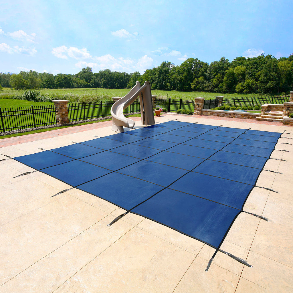 Arctic Armor mesh safety covers offer a durable and long-lasting solution for protecting your in-ground pool during the off-season. Crafted from maximum-strength, two-ply mesh with a break strength exceeding 4000-lbs, these premium covers ensure top-notch safety for your family. Featuring 5x5 spacing, double straps, and triple stitching, they are designed for maximum durability. The lightweight mesh allows rain to pass through while keeping leaves and debris out, making spring cleanup easy as water doesn't accumulate on the cover. Heavy-duty brass anchors secure the cover and recess flush with the pool deck for convenience when swimming season returns. Each cover includes a 2-foot overlap for a secure fit and comes complete with brass anchors, stainless-steel springs, buckles, installation tools, and an off-season storage bag. Enjoy peace of mind with an 18-year warranty, including full coverage for the first year.Attributes