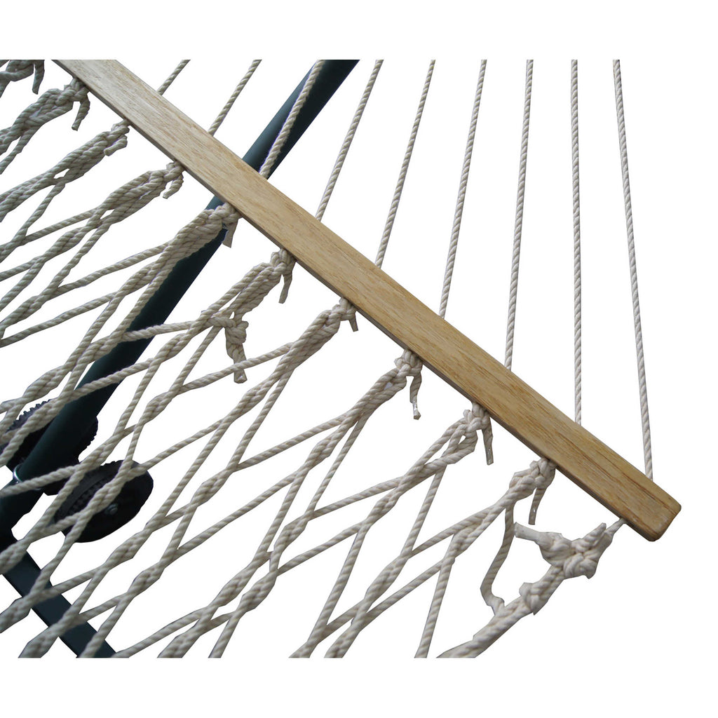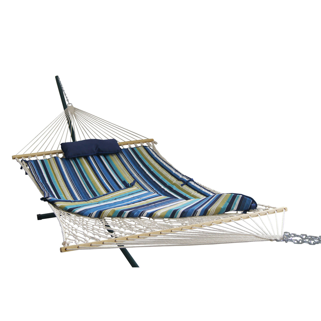 Turn any outdoor space into a comfortable, relaxing retreat! The Island Retreat 12-ft cotton rope hammock set with its stylish, modern, stripped polyester pad and comfortable pillow has everything you need to start relaxing right away. The stand wheels allow one person to move the hammock around to the desired location with ease. This oversized, comfortable 12-ft hammock is large enough for a single person to easily relax and enjoy afternoon days in the comfort of their backyard retreat. So go ahead, take a moment to breathe in the fresh air and totally relax in your carefully crafted Island Retreat hammock. Weight capacity: 275-lbs. 1-year limited warranty.Attributes