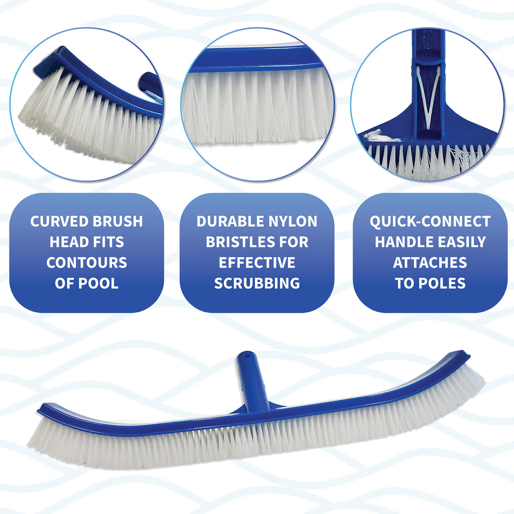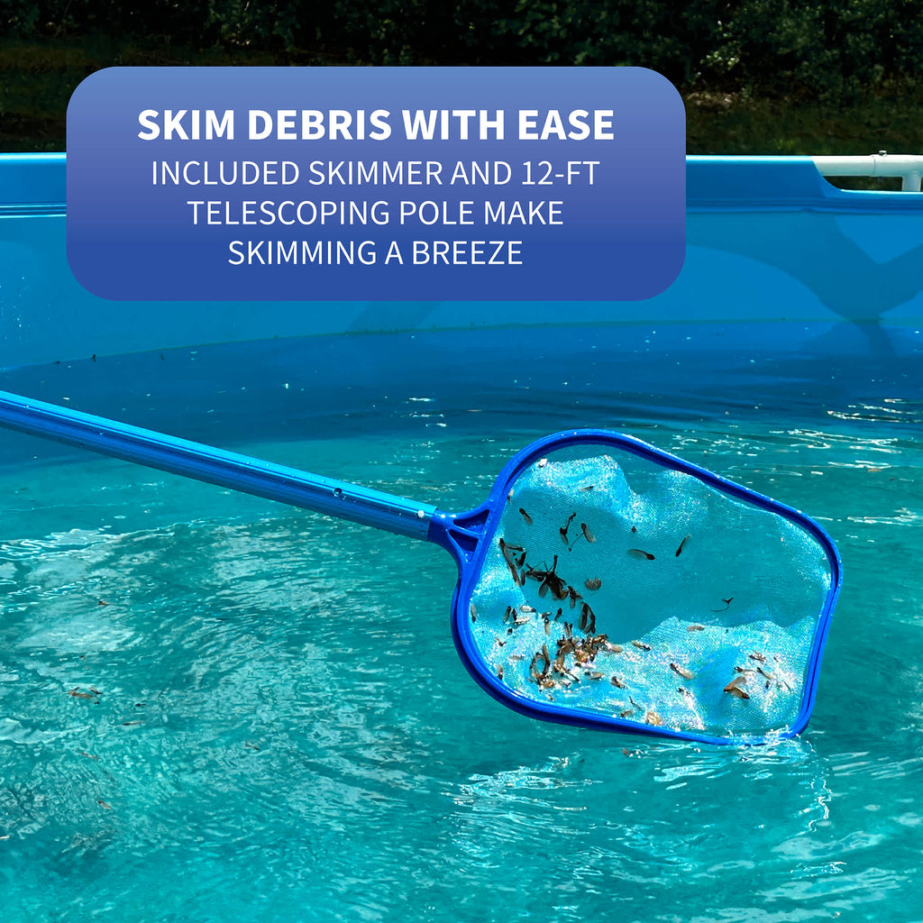 An above-ground pool maintenance kit is essential for keeping your pool clean, clear, and inviting throughout the swimming season. Ideal for soft-sided, quick-set, or small steel wall pools, this accessory kit includes all the tools needed to keep your pool water sparkling. Comes with one 3-piece 12-ft pole, leaf skimmer, thermometer, 25-ft vacuum hose, vinyl liner vacuum head, and nylon wall brush. The telescoping pole attaches to the included brush, net, and vacuum, as well as most other pool equipment designed for aluminum poles. Interchangeable heads let you switch between tasks effortlessly.Attributes